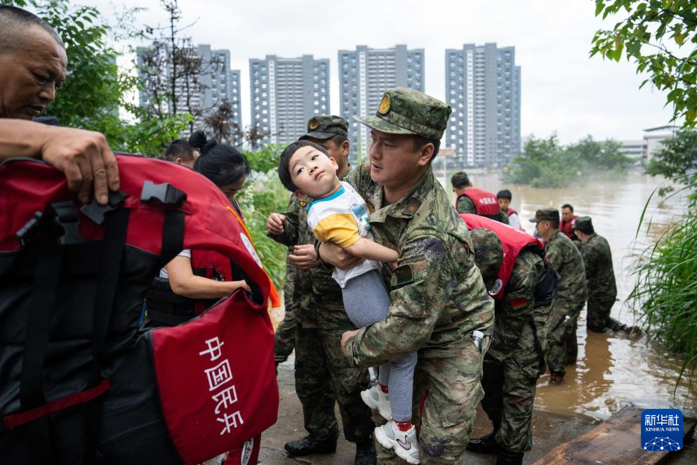2024年7月1日,在湖南省平江县天岳街道大西村,民兵转移遭遇洪涝灾害的危险点位群众。