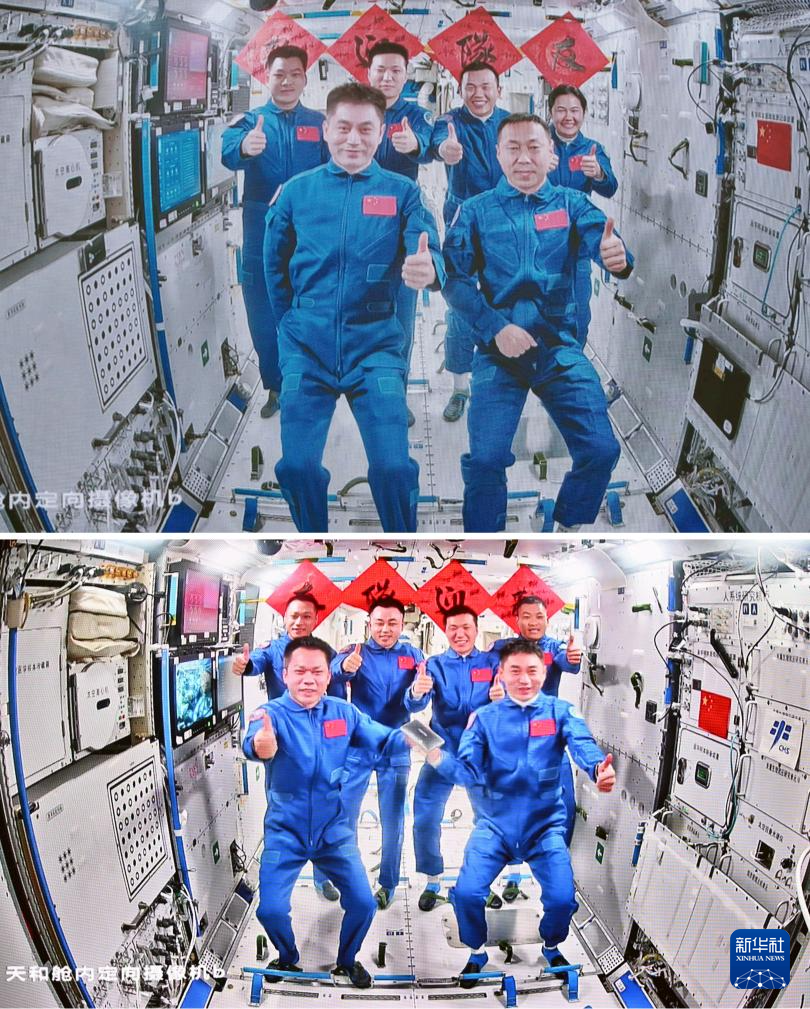 拼版照片:上图为2024年10月30日在北京航天飞行控制中心拍摄的神舟十九号航天员乘组和神舟十八号航天员乘组“全家福”;下图为2024年4月26日拍摄的神舟十八号航天员乘组和神舟十七号航天员乘组“全家福”。