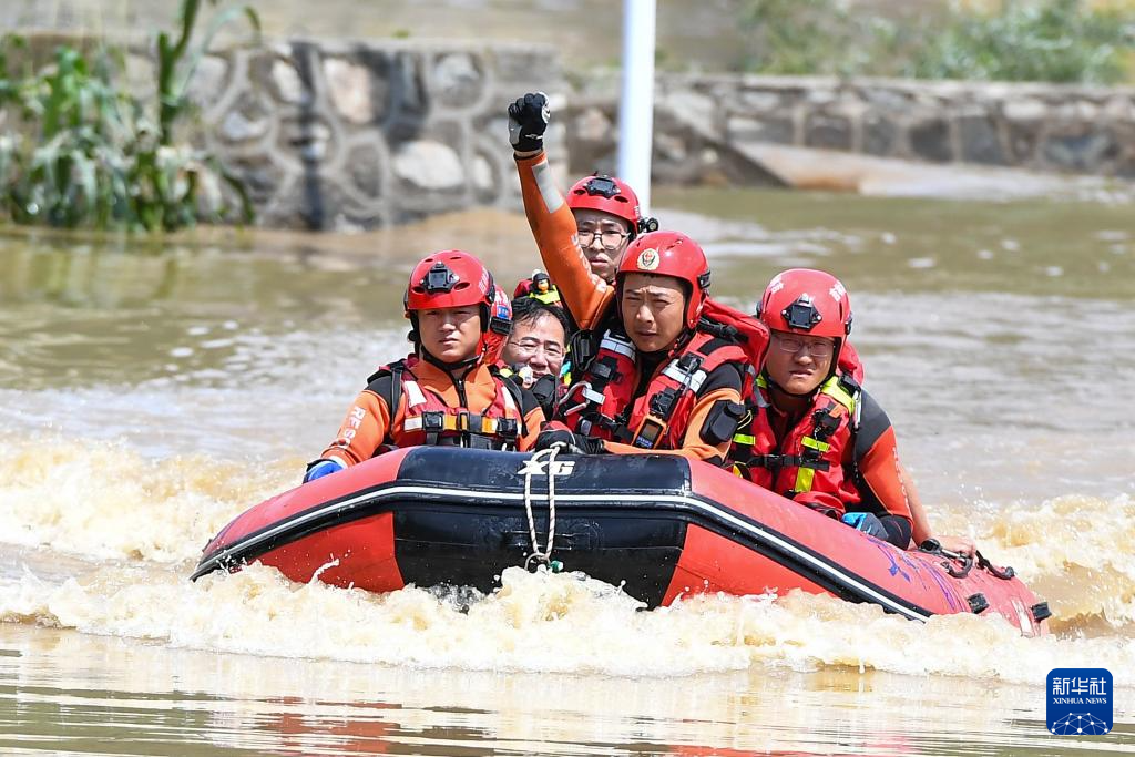 2024年7月29日,在吉林省临江市,临江市消防救援大队世纪大街站副站长白云天(右二)在转运被洪涝灾害围困的群众时,用手势指挥队员操控船只。