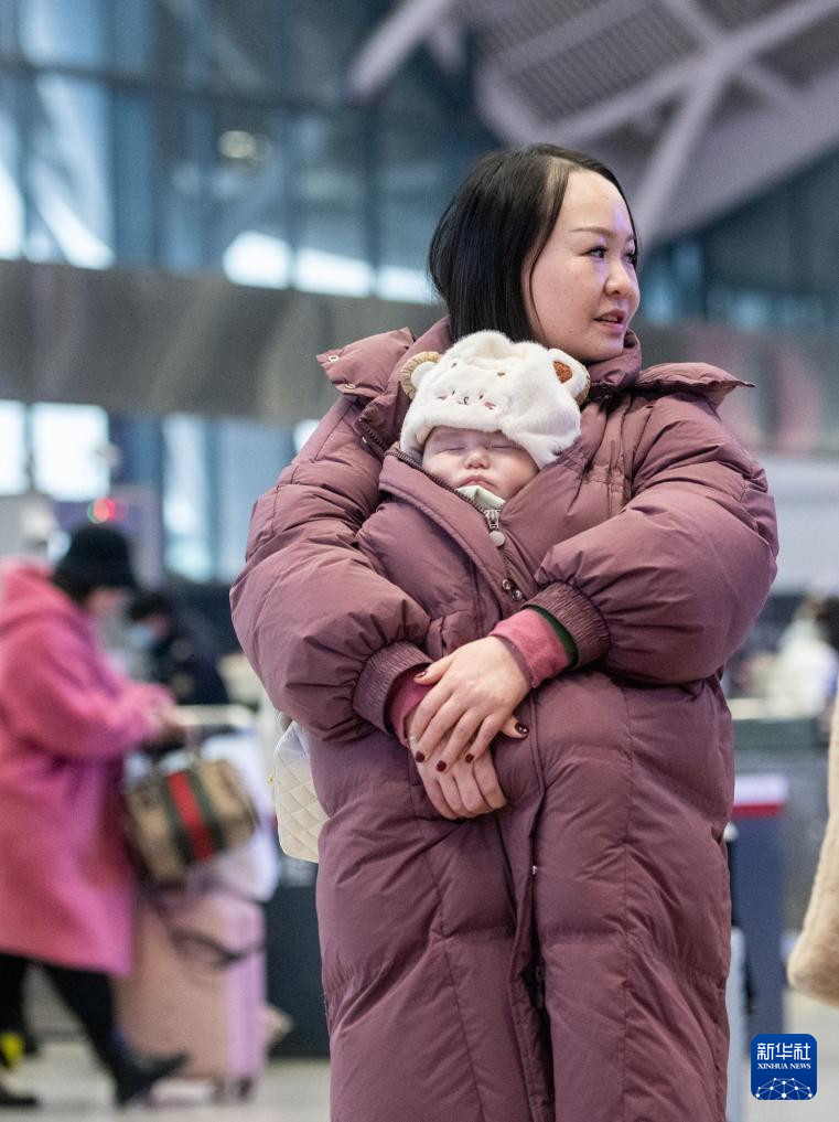 2024年1月26日,春运首日,一位母亲带着孩子在湖北武汉站候车。