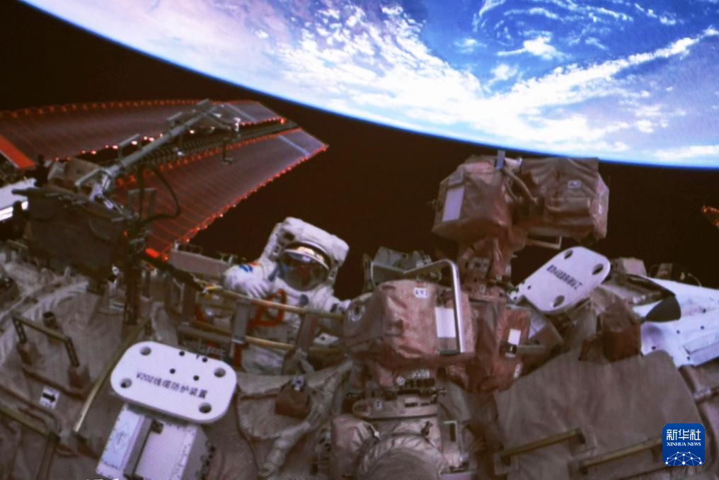 2024年7月3日在北京航天飞行控制中心拍摄的神舟十八号航天员李聪出舱的画面。