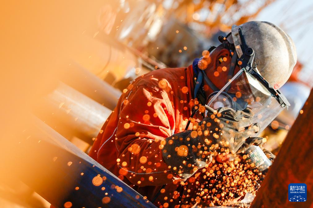 2024年5月1日,工人在天津海油工程塘沽建造场地进行海上平台建造施工。