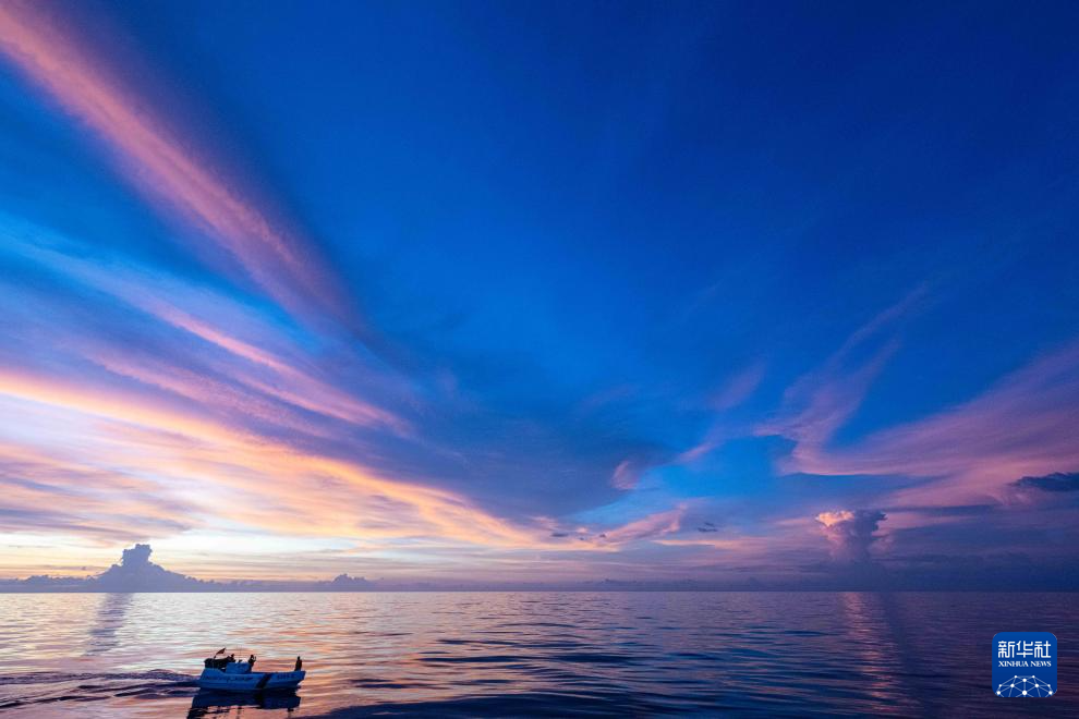 2024年5月1日,在中国南沙群岛仁爱礁海域,一艘舰载小艇在晚霞中结束训练归来。隶属于中国海警局第五局的华阳舰及其海警执法员们与其他海警舰艇一起执行该轮仁爱礁巡航值守任务,坚定戍卫祖国南沙海疆,维护祖国海洋权益。