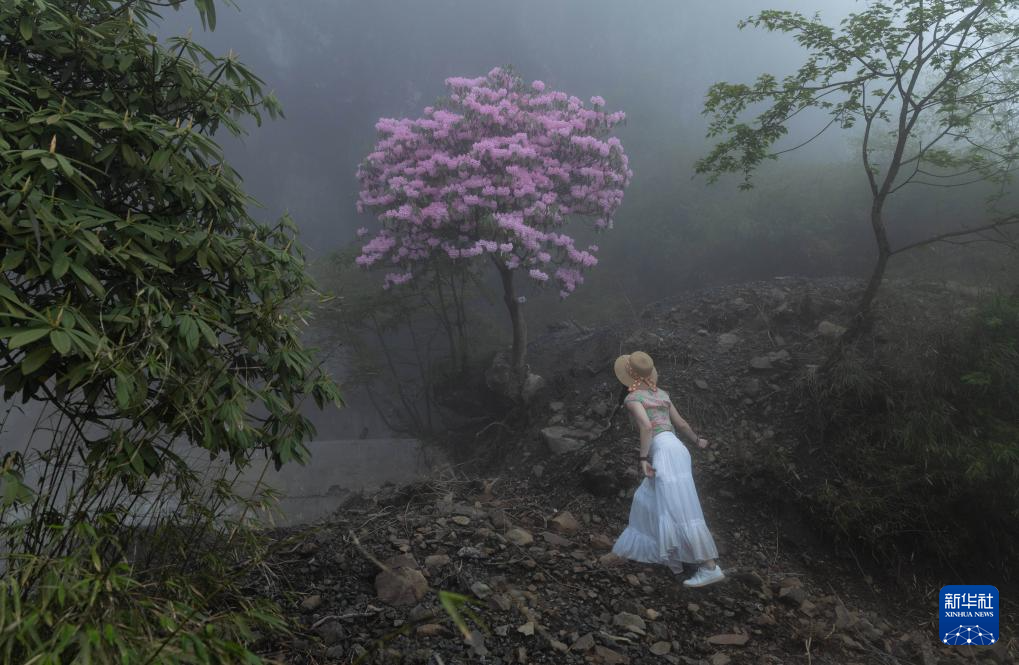 2024年5月11日,在四川省眉山市洪雅县境内的瓦屋山景区半山画廊栈道边,一名游客走近一株盛开的杜鹃花树。