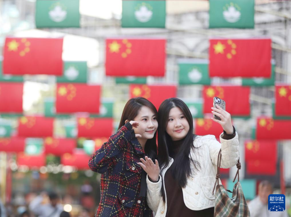 2024年12月20日,游客在澳门议事亭前地留影。12月20日是澳门回归祖国25周年纪念日。