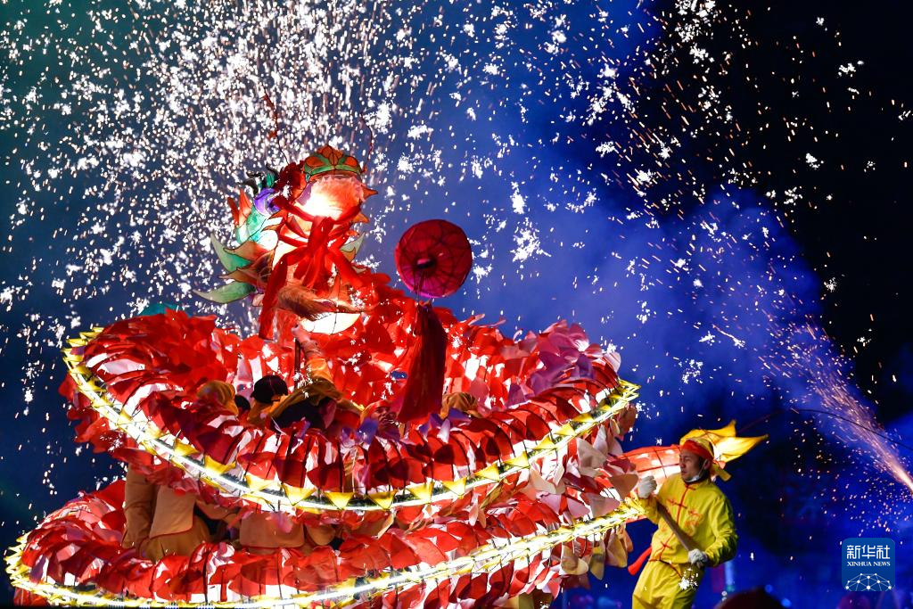 2024年2月23日晚,人们在贵州省黔东南苗族侗族自治州台江县参加苗族“舞龙嘘花”活动。