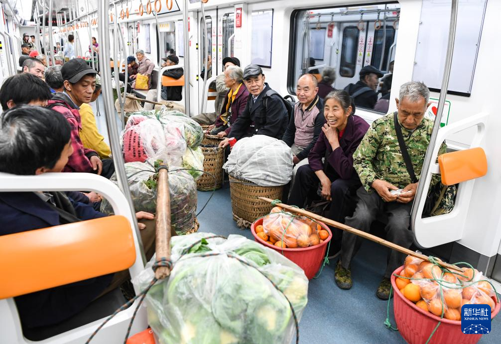 2024年3月27日,菜农乘坐重庆轨道交通4号线,准备前往城区的菜市场售卖农产品。重庆轨道交通4号线二期是一条连接渝北区石船镇和市区的轨道交通线路,被大家亲切地称为“背篓专线”。