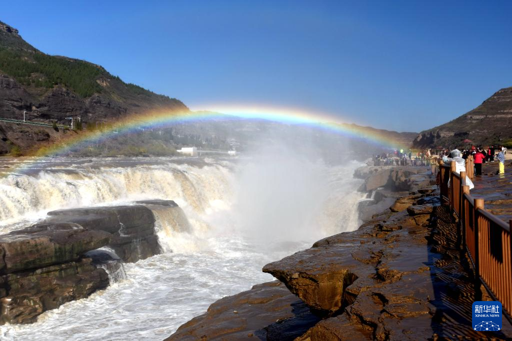 2024年11月4日,游客在山西吉县黄河壶口瀑布欣赏“彩虹桥”景观。