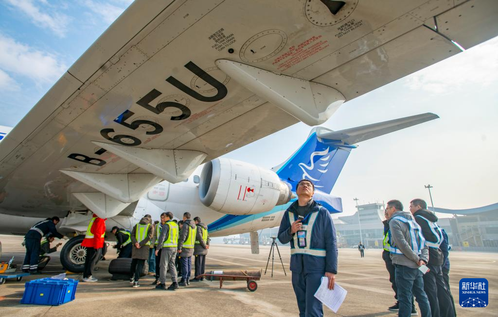 2024年12月31日,重庆万州五桥机场,技术人员为执行本次验证飞行测试的国产C909飞机安装国产制动系统零部件。