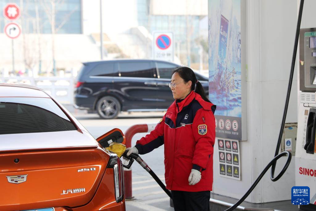 1月2日,河北石家庄新乐市一家加油站工作人员给车辆加油。