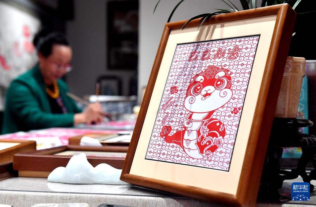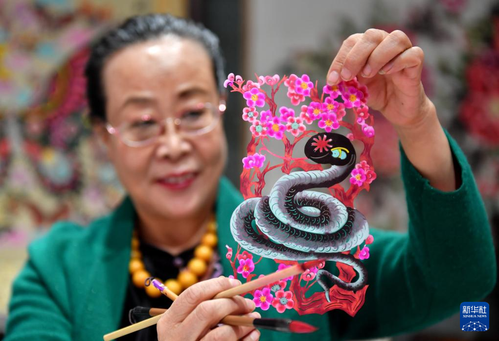 1月3日,蔚县剪纸国家级代表性传承人周淑英在河北省石家庄市新华区名家工作室展示生肖蛇作品。