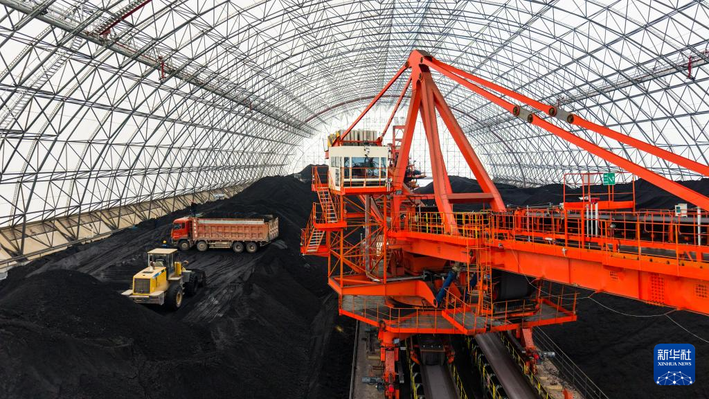 1月3日,工作人员在华能正宁电厂储煤场内堆存燃煤(无人机照片)。