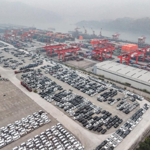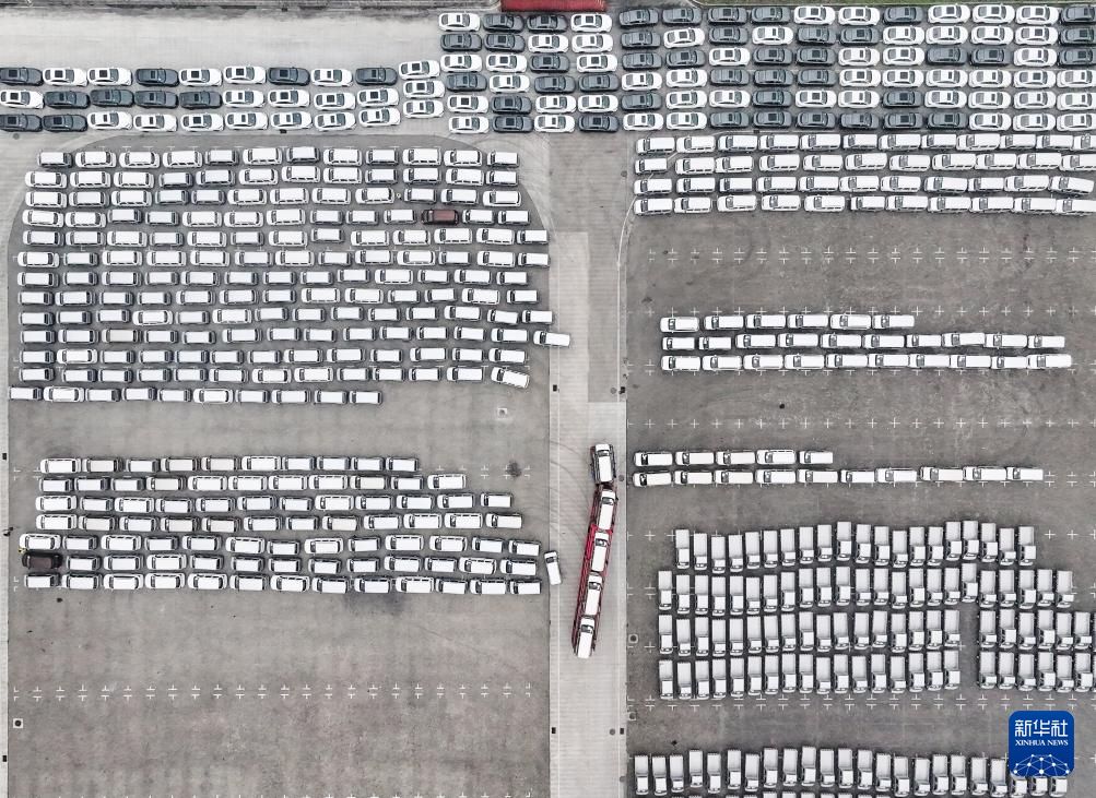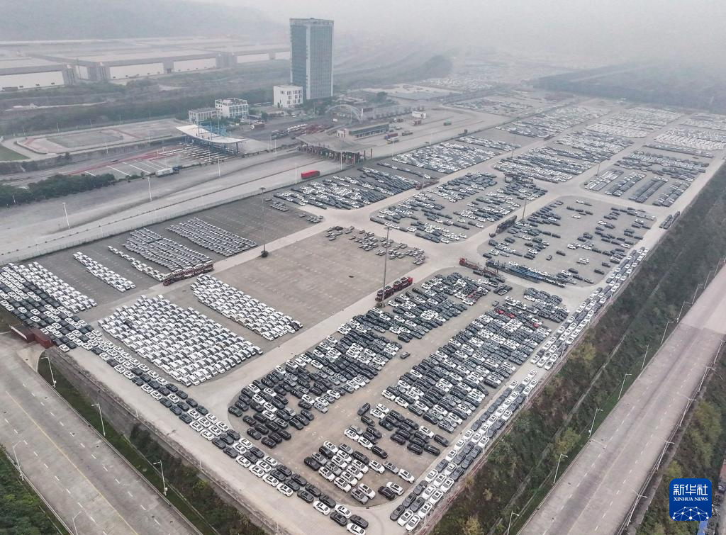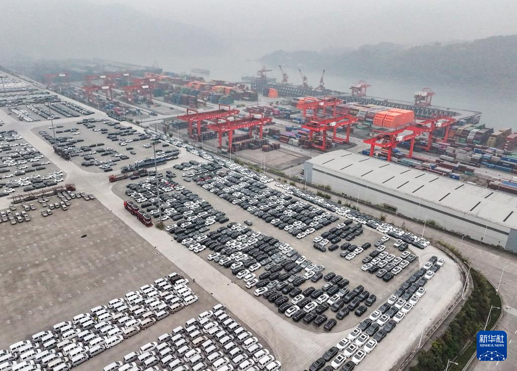 这是2025年1月2日在重庆果园港拍摄的准备装运的汽车(无人机照片)。