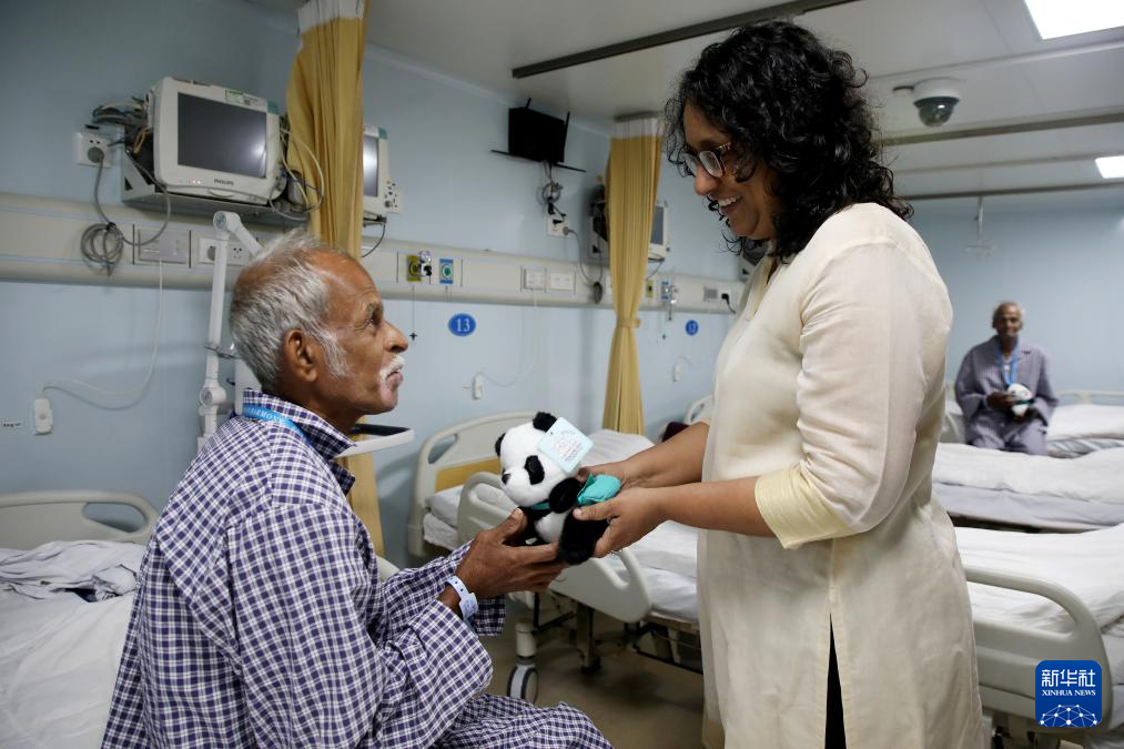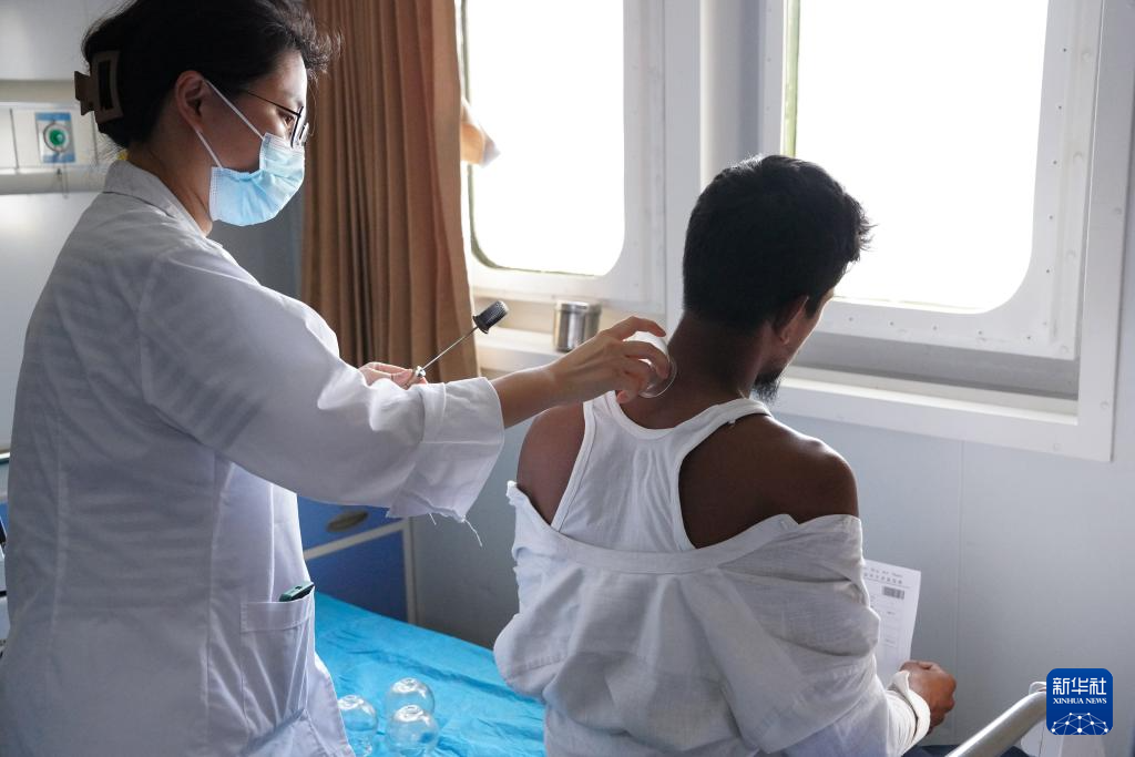 2024年12月24日,在斯里兰卡科伦坡港,中国海军“和平方舟”号医院船上的医生为19岁的小伙穆贾希德拔火罐。