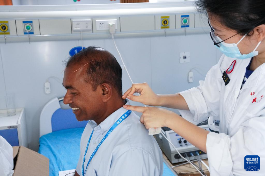 2024年12月24日,在斯里兰卡科伦坡港,中国海军“和平方舟”号医院船上的医生为当地居民做针灸。
