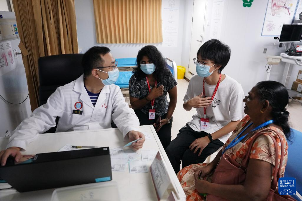 2024年12月24日,在斯里兰卡科伦坡港,中国海军“和平方舟”号医院船上的医生在志愿者的帮助下对当地患者进行问诊。