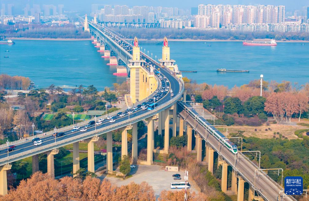 1月4日,动车组列车行驶在江苏省南京市境内(无人机照片)。