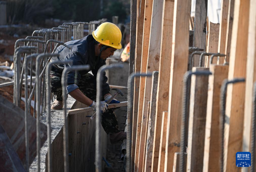 1月3日,工人在位于海口西海岸的天迹泳池项目工地施工。