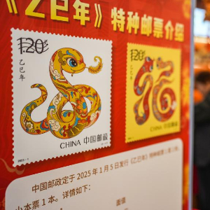 中国邮政1月5日发行《乙巳年》特种邮票。《乙巳年》特种邮票以敦煌壁画和传统民俗为灵感来源,将蛇的形象与吉祥寓意巧妙结合。邮票一套两枚,图案名称分别为“蛇呈丰稔”“福纳百祥”。