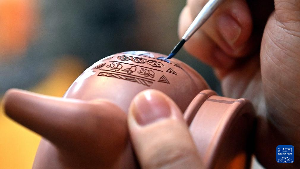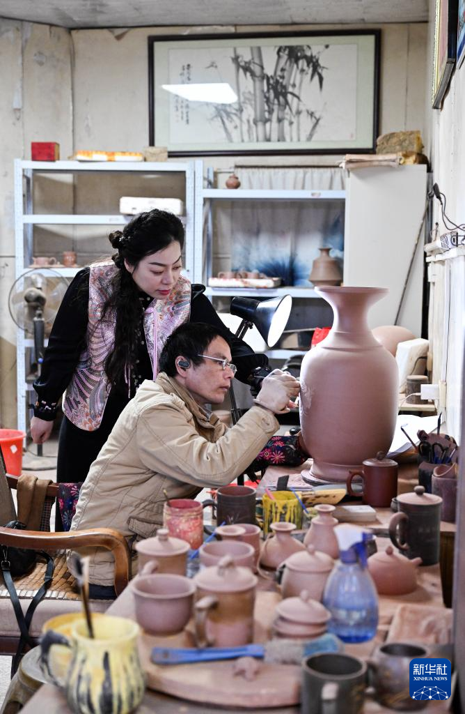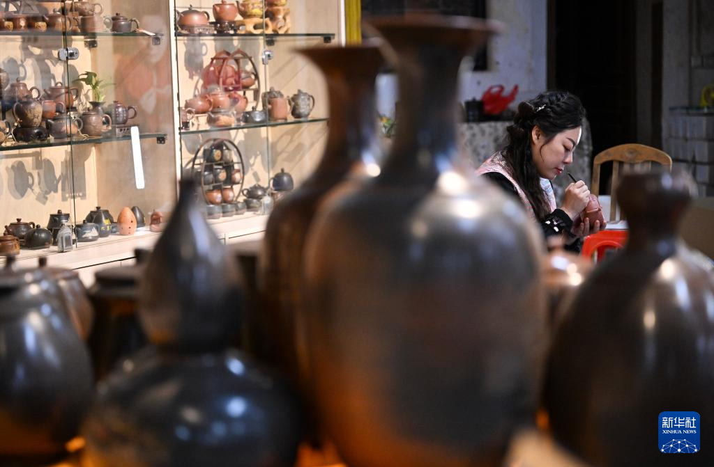 1月2日,郭卉在工作室里为雕刻好的茶壶彩绘。