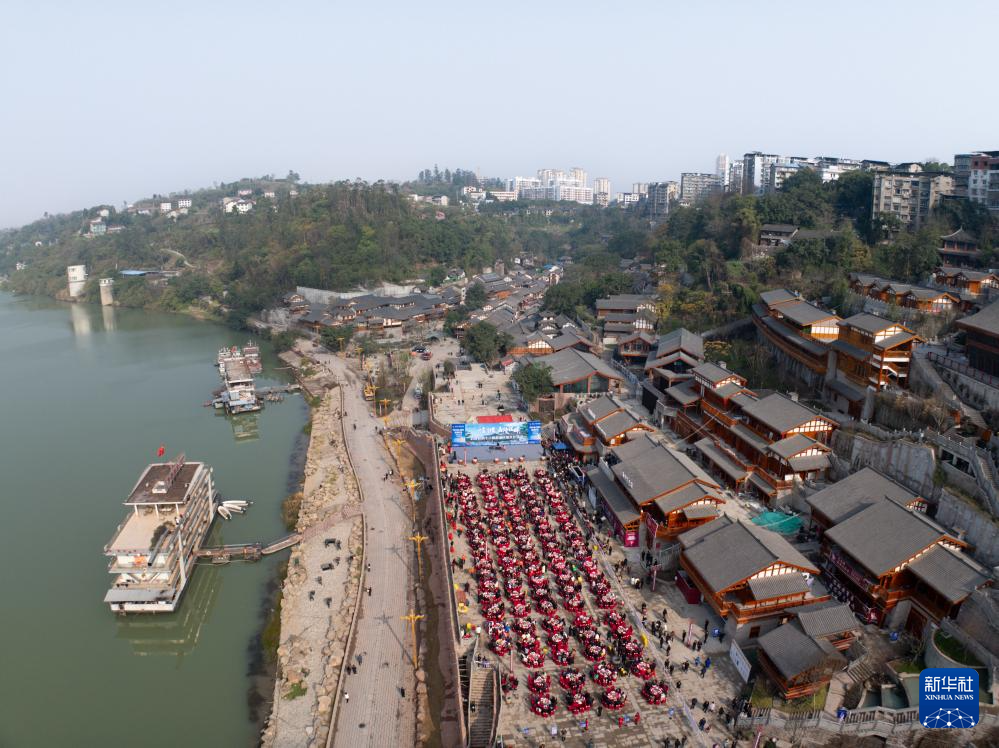 1月5日,在武胜县沿口古镇,人们共吃庖汤宴(无人机拍摄)。
