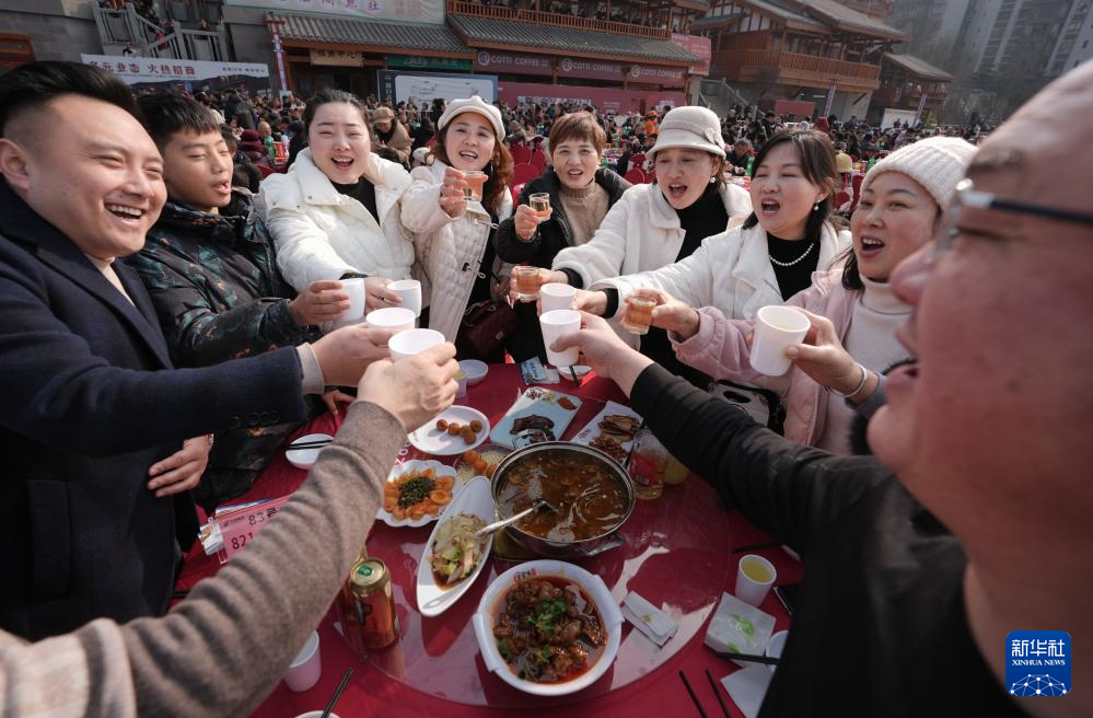 1月5日,在武胜县沿口古镇,参加庖汤宴的群众举杯相庆。