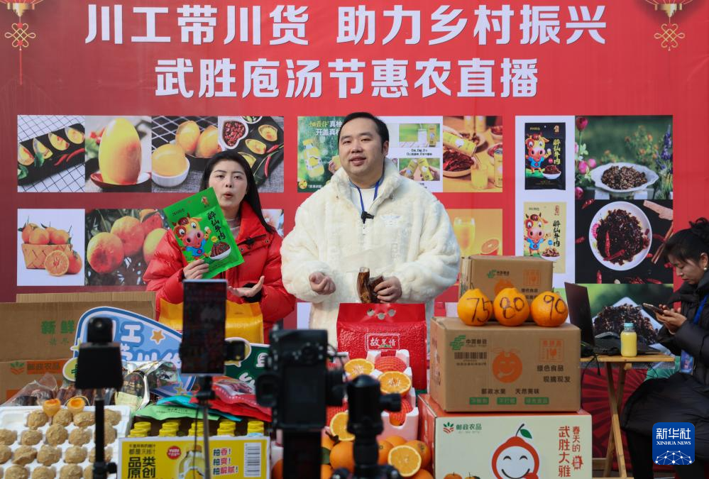 1月5日,在武胜县沿口古镇庖汤民俗文化活动现场,当地主播通过网络直播带货。