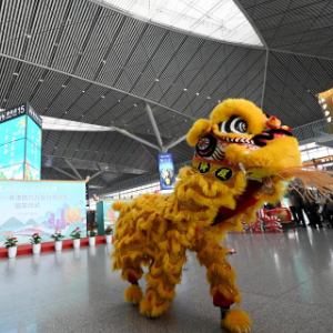 1月5日,在西安北站候车大厅,舞狮演员在西安北至香港西九龙复兴号动车首发仪式上为旅客表演。