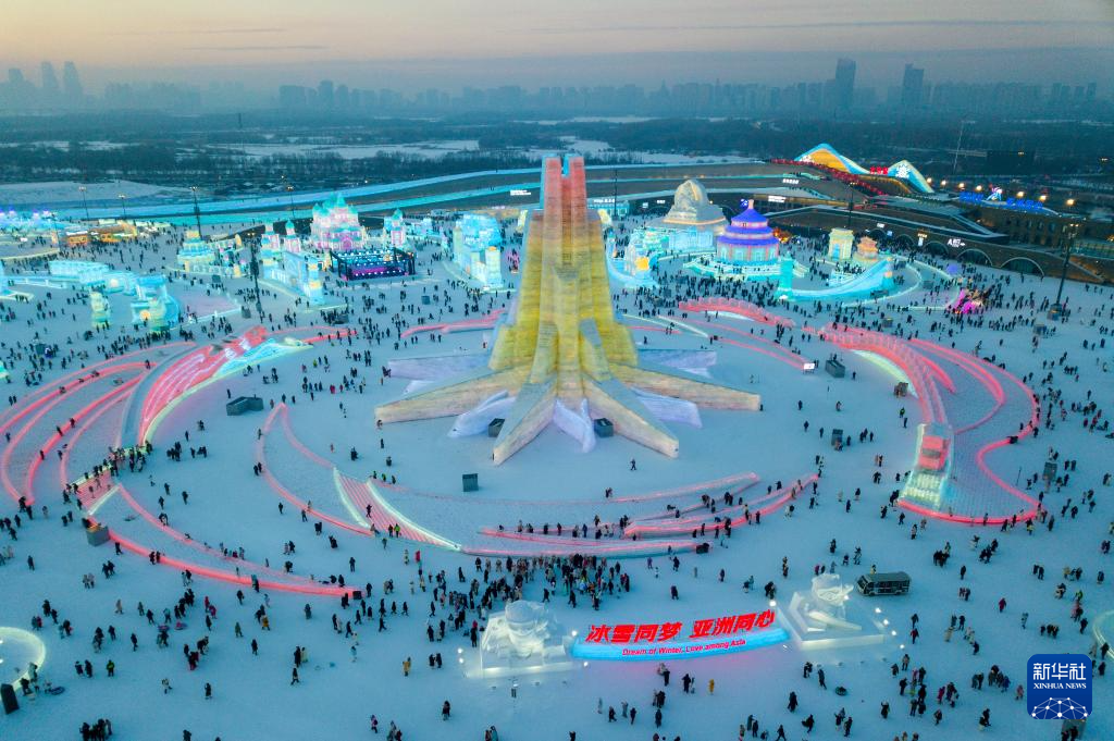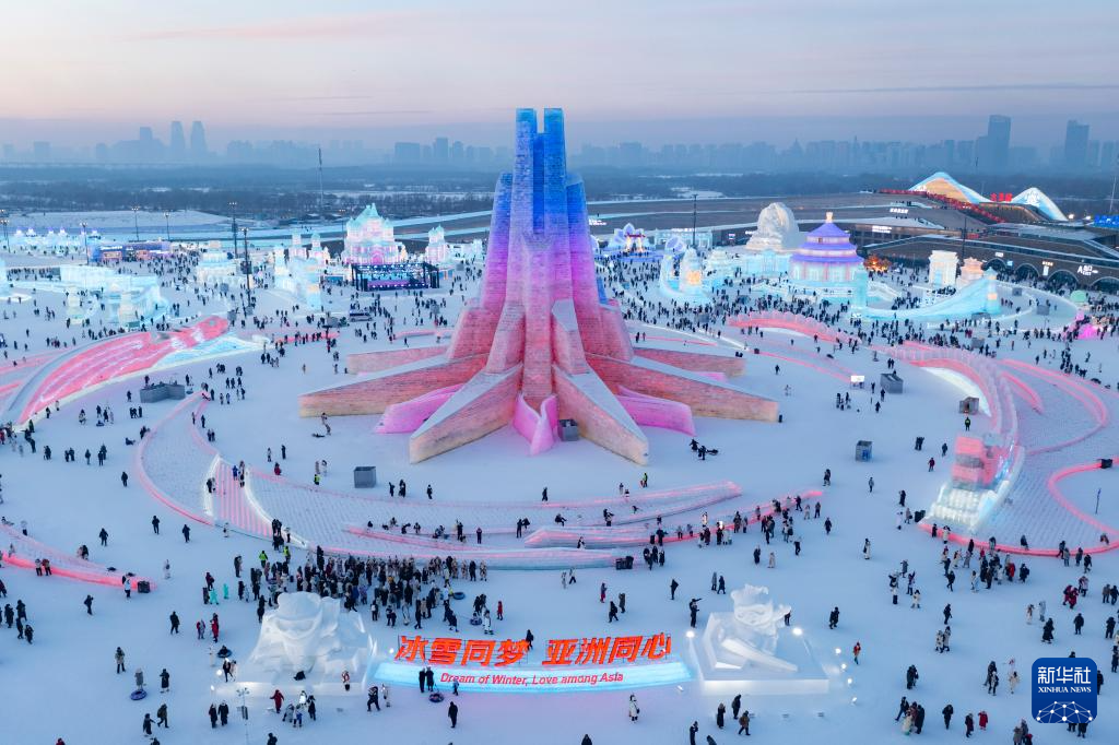 1月5日,在哈尔滨冰雪大世界园区,游客在主塔“亚洲同心”附近游玩(无人机照片)。