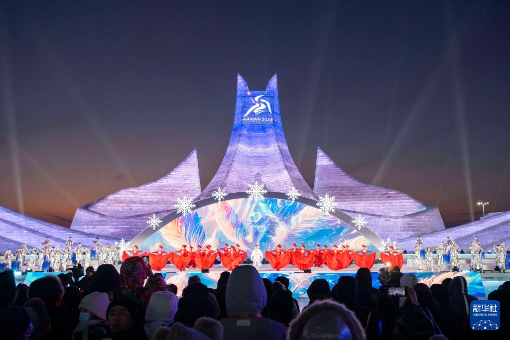 1月5日,在哈尔滨冰雪大世界园区,人们观看第41届中国·哈尔滨国际冰雪节开幕式演出。