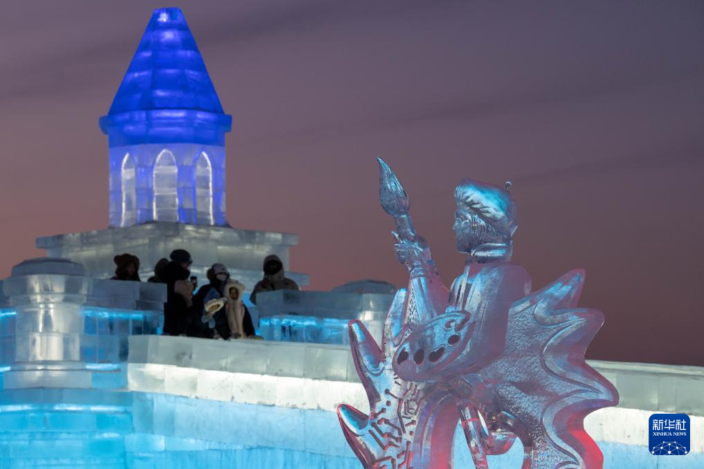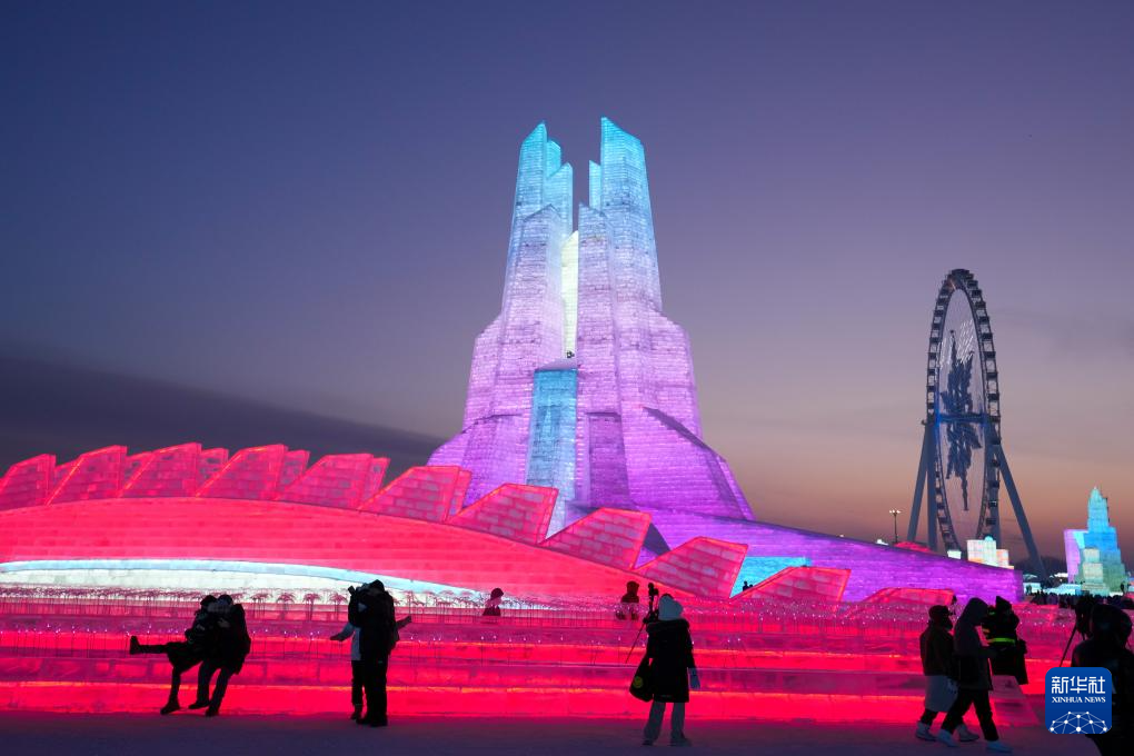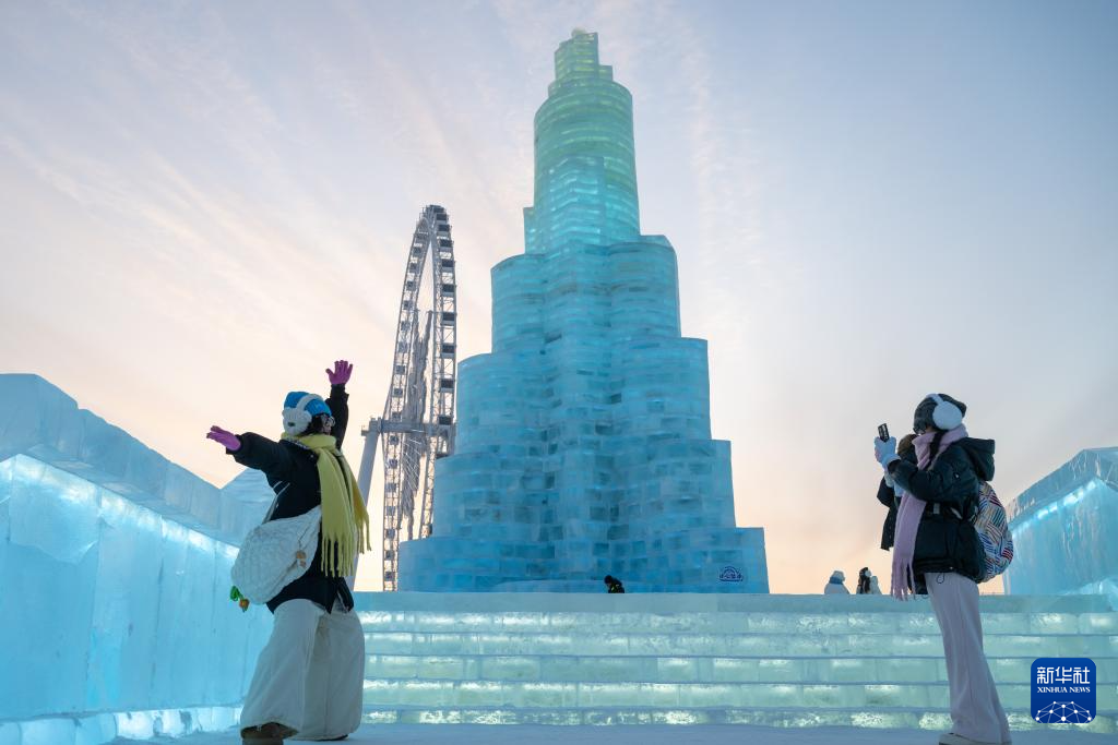 1月5日,游客在哈尔滨冰雪大世界园区内游玩、拍照。