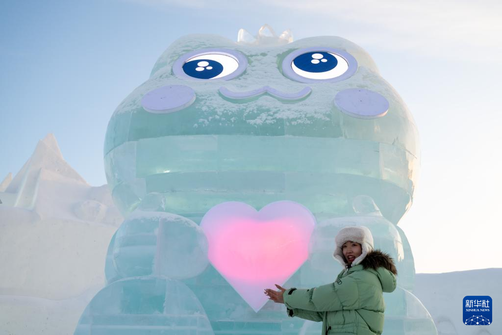 1月5日,游客在哈尔滨冰雪大世界园区内拍照。