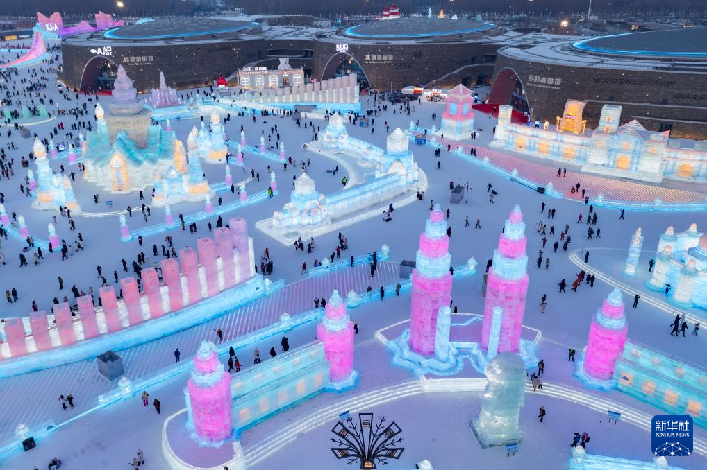 1月5日,游客在哈尔滨冰雪大世界园区内游玩(无人机照片)。