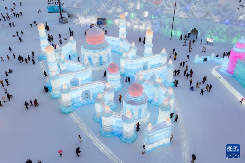 1月5日,在哈尔滨冰雪大世界园区,游客在一处大型冰建景观附近游玩(无人机照片)。