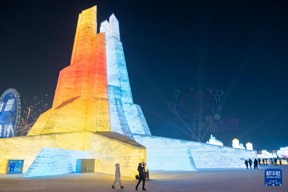 1月5日,在哈尔滨冰雪大世界园区,游客观看第41届中国·哈尔滨国际冰雪节开幕式上的无人机表演。