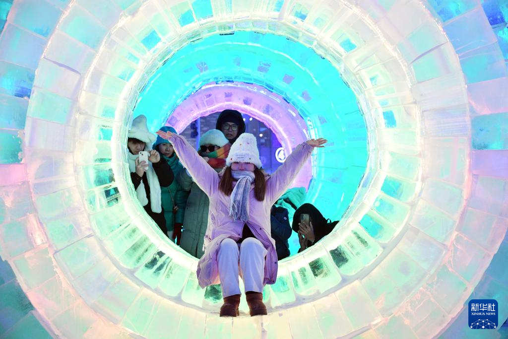 1月5日,游客在哈尔滨冰雪大世界园区玩冰滑梯。