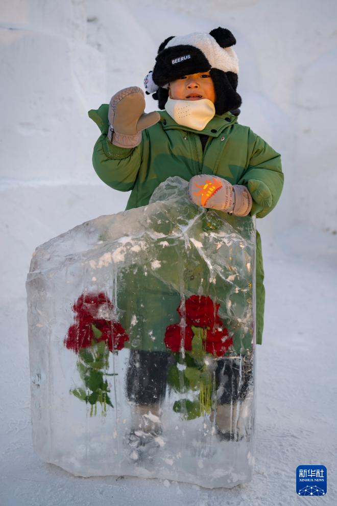 1月5日,在哈尔滨冰雪大世界园区,小朋友在“冰封玫瑰”景观旁游玩。