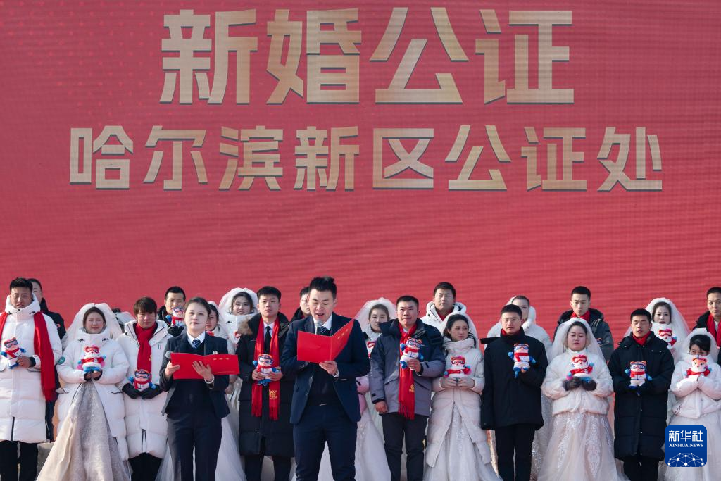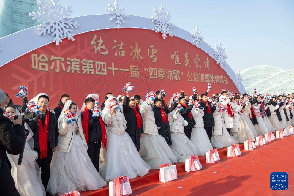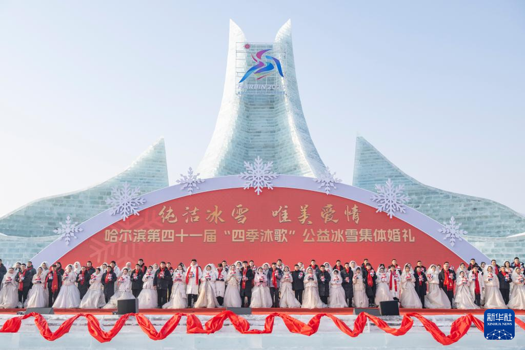 当日,作为哈尔滨国际冰雪节重点活动之一的哈尔滨第四十一届“四季沐歌”公益冰雪集体婚礼在哈尔滨冰雪大世界举行,来自全国17个省(区市)的43对新人在冰雪中喜结良缘。