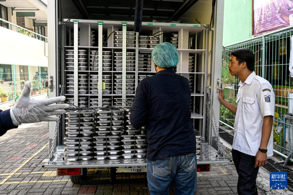1月6日,在印度尼西亚雅加达,工作人员从卡车上卸下营养餐。