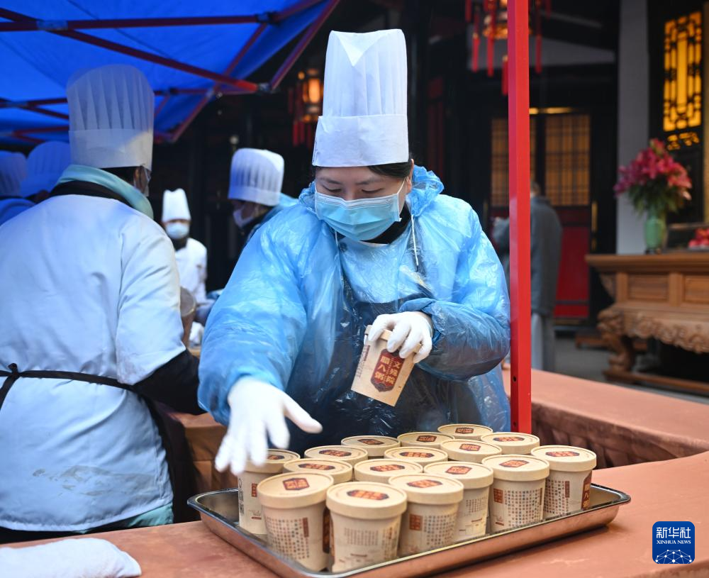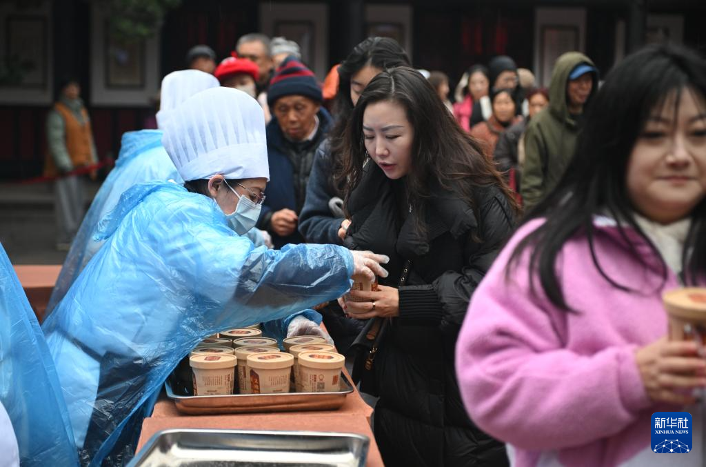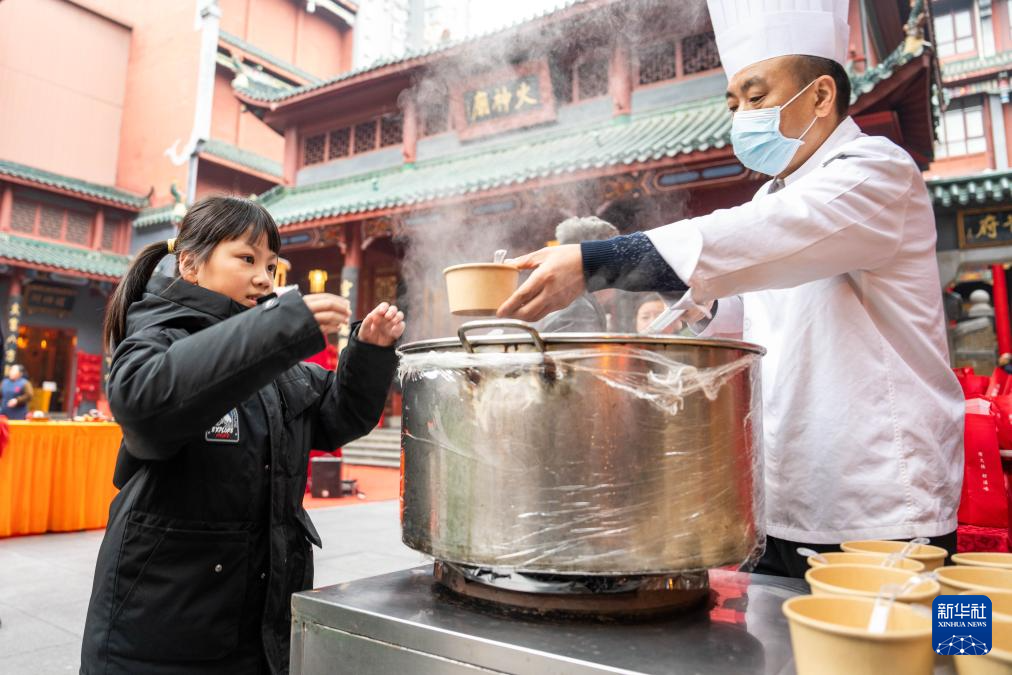 1月7日,人们在四川省成都文殊院品尝免费领取的腊八粥。