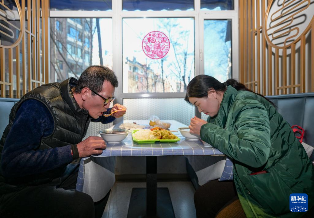 1月7日,居民在宁夏银川市金凤区长城花园社区食堂品尝免费领取的腊八粥。