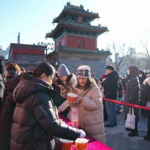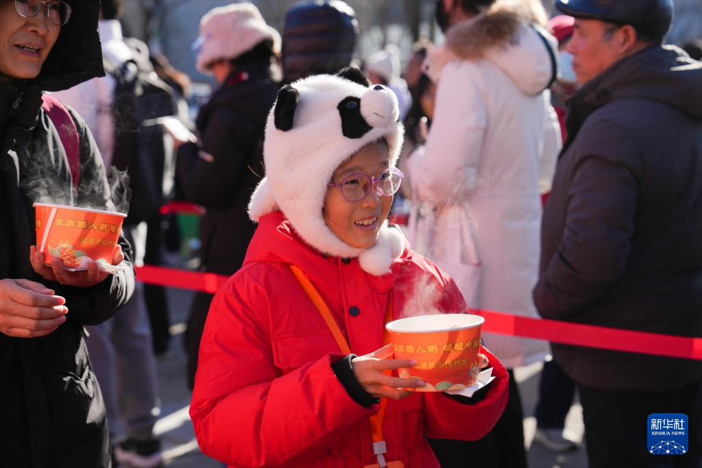 1月7日,市民游客在北京民俗博物馆举办的“腊八赠福粥 喜迎中国年”活动上领取腊八粥。