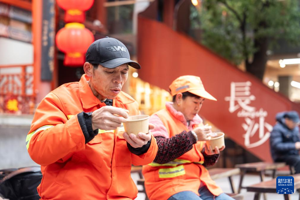 1月7日,在湖南省长沙市坡子街火宫殿,环卫工人在品尝免费领取的腊八粥。