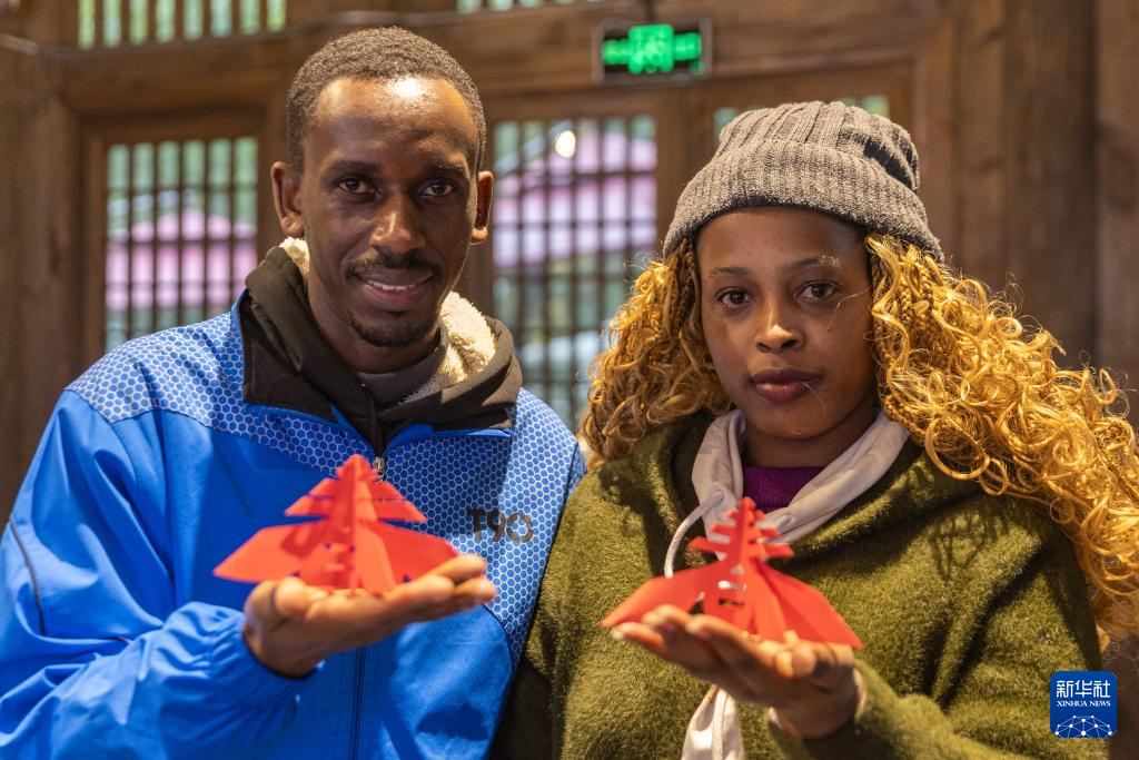 1月7日,在重庆市北碚区偏岩古镇,留学生展示自己制作的剪纸作品。