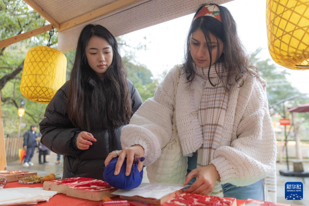 1月7日,在重庆市北碚区偏岩古镇,留学生体验传统拓印。