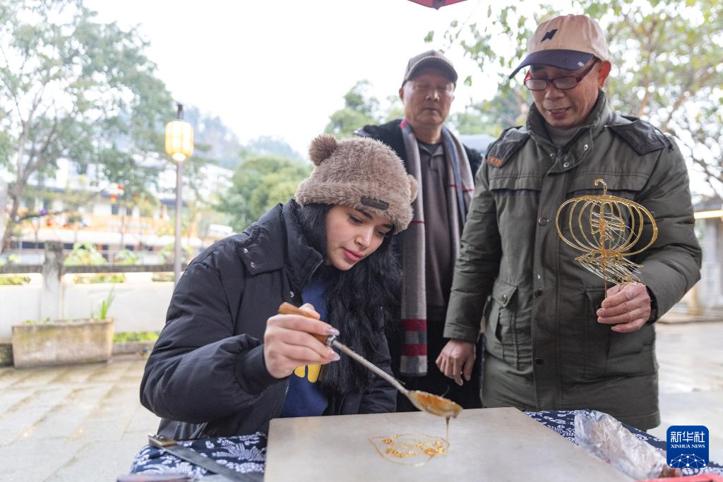 1月7日,在重庆市北碚区偏岩古镇,留学生体验糖画制作。