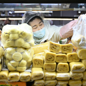 1月8日,在延安市宝塔区一处市场,工作人员码放食品。