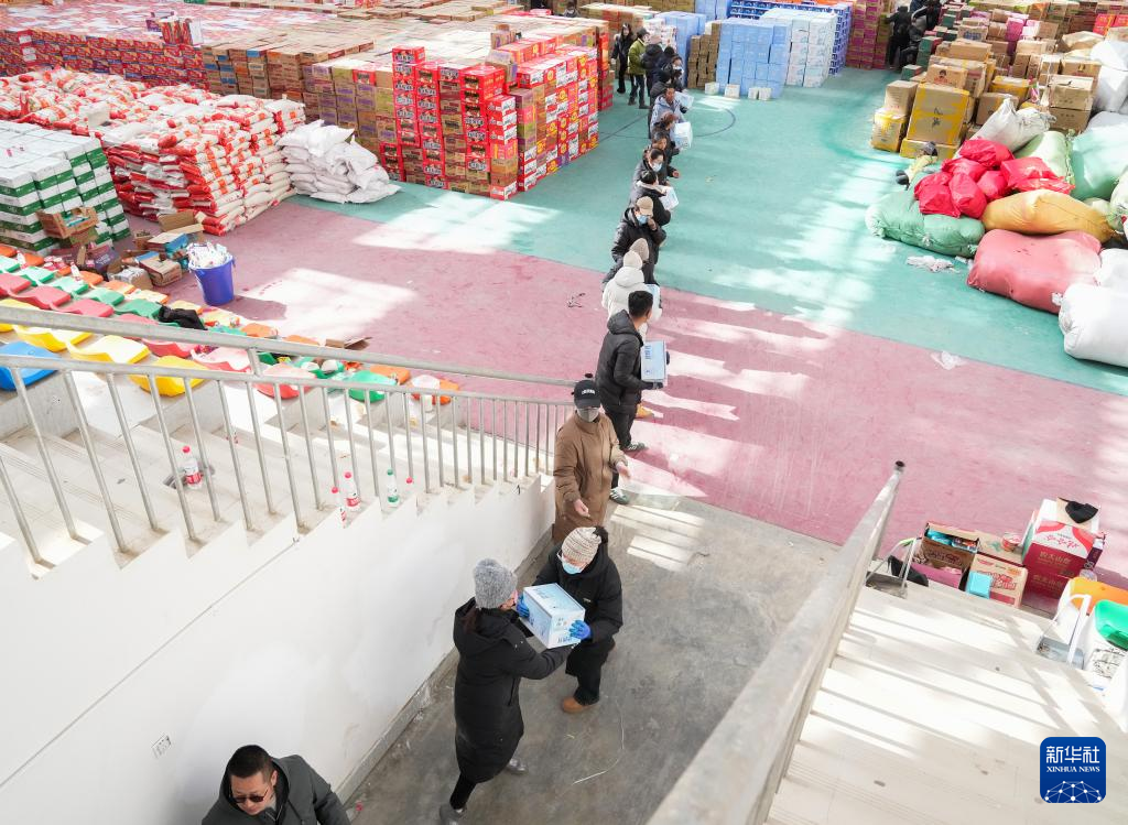 1月8日,在定日县人民政府的救援物资点,干部群众接力传递救援物资。