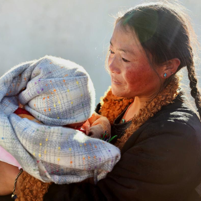 1月8日,定日县长所乡通来村的受灾群众措姆抱着自己的孩子在领取志愿者送来的御寒衣物。