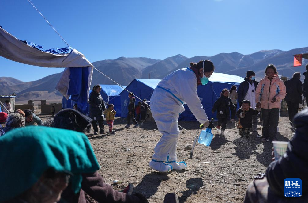 1月8日,在定日县措果乡野江村安置点,医护人员进行消杀。